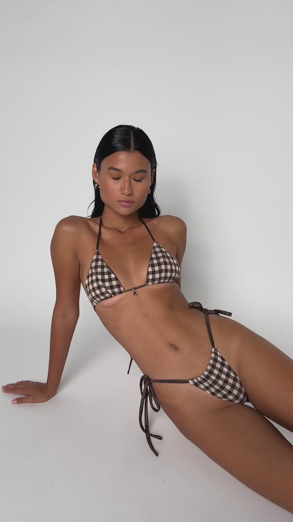 The Honey top is a must-have for any wardrobe. With its versatile design and signature Phukini paneling, it can be worn all year round. The triangle shape and custom gold Phukini charm add a touch of elegance, making it perfect for any occasion.